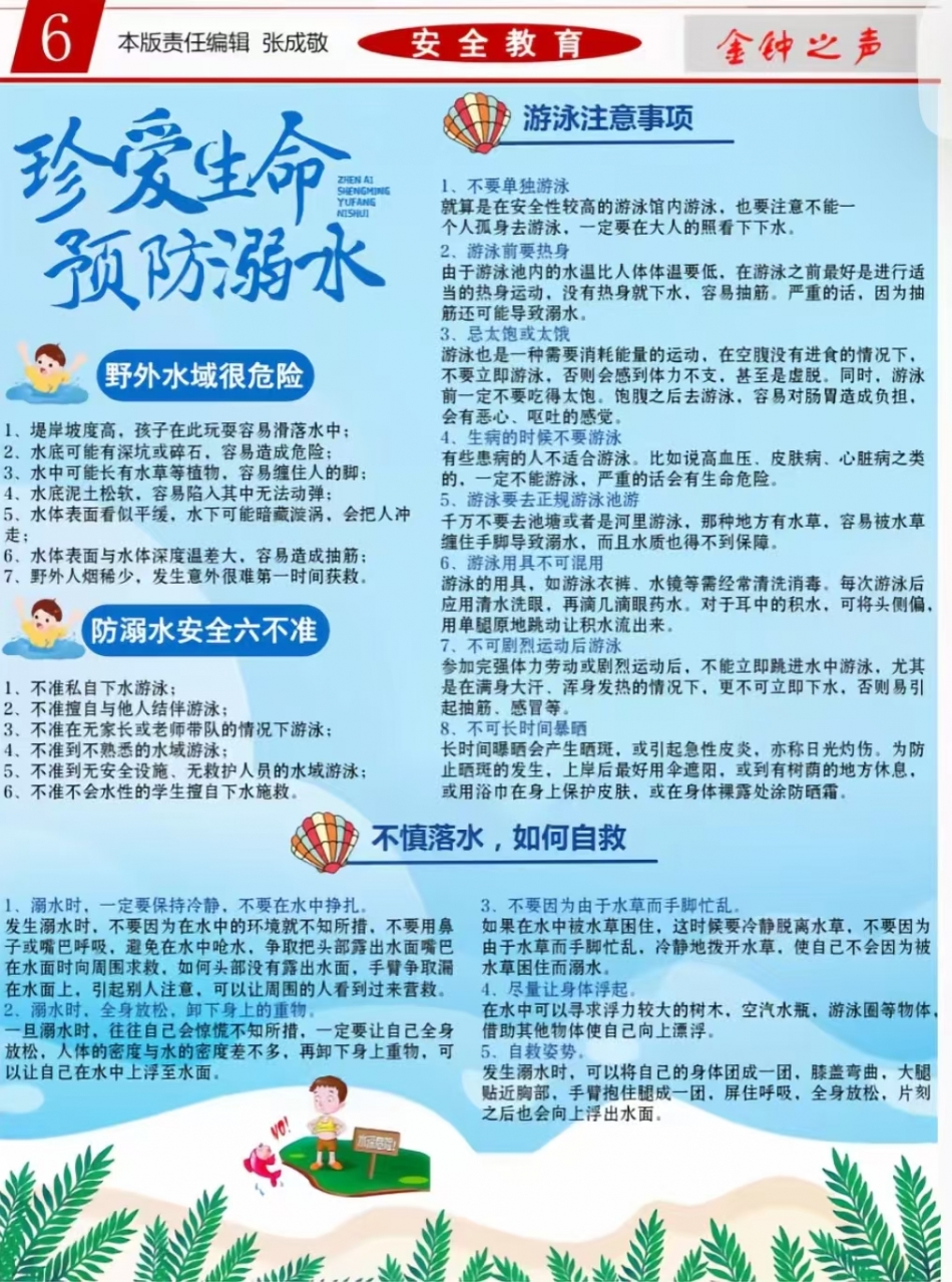 盛夏时节,热浪袭人,戏水纳凉成为不少人消暑降温的首选。然而,在看似惬意的水面之下,可能暗藏着危害人们健康的东西。为筑牢安全防线,提升安全意识,掌握实操技能yL23411永利集团官网近日全面启动防溺水安全主题教育活动,号召全院师时刻绷紧生命安全弦,将“安全第一”的理念融入日常,让防溺水意识真正入脑入心。